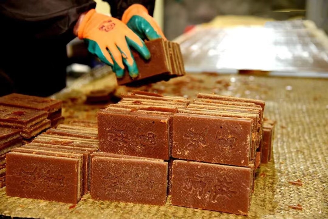 记者在该糖厂看到,各环节制糖师傅正忙个不停,工人们正把新鲜砍收的甘蔗放入压榨机榨汁,甘蔗汁经过滤后,通过密封管道进入大锅熬煮,师傅们对大锅中的泡沫进行打捞,沉清后进行煮熬。在煮糖环节,前三个锅主要用以沥干水分,后四个锅则起凝糖起砂的作用。其间,师傅还需不时使用一个巨大的漏勺打捞出各个锅中泛起的泡沫杂质。经过长时间的熬煮,甘蔗汁被熬成浓稠的糖稀,然后糖稀被舀进凉锅里搅拌打砂,最后被倒入模具中,待完全冷却成型,就会成为甘甜入心的“红糖”,最后进行精美的包装,销往各地。