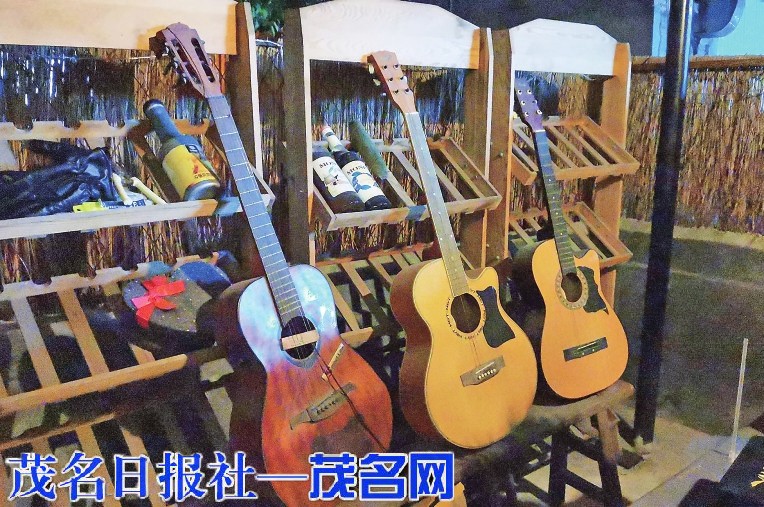 一边品茶,一边欣赏音乐。店内摆着吉他,顾客可以即兴弹奏一曲。小院子布置成古朴自然的风格。夜晚闲暇时光,志同道合的朋友一起吹拉弹唱,自娱自乐。小资花样的咖啡露厅。年轻人在咖啡厅里。别具特色的小院子。茂名