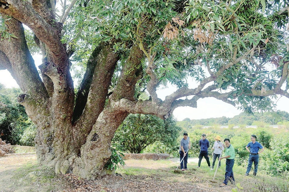 据了解,目前这棵荔枝树归当地的龙新、龙兴、龙二这三个村民小组所有。吕英胜是龙新小组的组长,他的父亲吕斌和生前也是这棵黑叶古荔树的保护人之一,8年前他从父亲手中接棒保护这棵古荔树。在吕英胜记忆中,父亲常常拎着锄头到这棵树下除草、打虫、施肥,荔枝收获的季节,父亲便带着他一起来摘荔枝。如今,吕英胜也像父亲一样,一年四季打理着荔枝树,果实成长期为它施肥、打虫;台风天时为它加固,防止树枝被台风吹倒;还不定期清理它周边和树上的杂草,为它提供良好的生长环境。“今年来给它清理过好多次杂草,打了3次药了。”吕英胜一边说,一边拿起锄头将荔枝树周边的杂草清除干净。