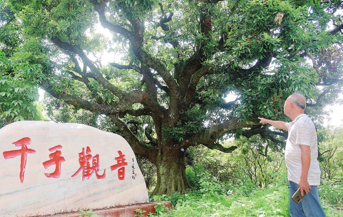 说起南山古荔园的古荔树,吕国俊娓娓道来。相传,这里的古荔枝树是由“仙人”播种,在西汉时期,鸡公河流域风景优美,吸引天上的“仙人”时常前来游玩,当地村民得知“仙人”到来便拿出籺、水果等给“仙人”吃,“仙人”为感谢热情的村民便将好的荔枝树种在此处,后来村民们又建起了多台水车灌溉荔枝林,荔枝树长年生长旺盛,结出丰硕果实。当地将一处水潭命名为“仙人潭”。