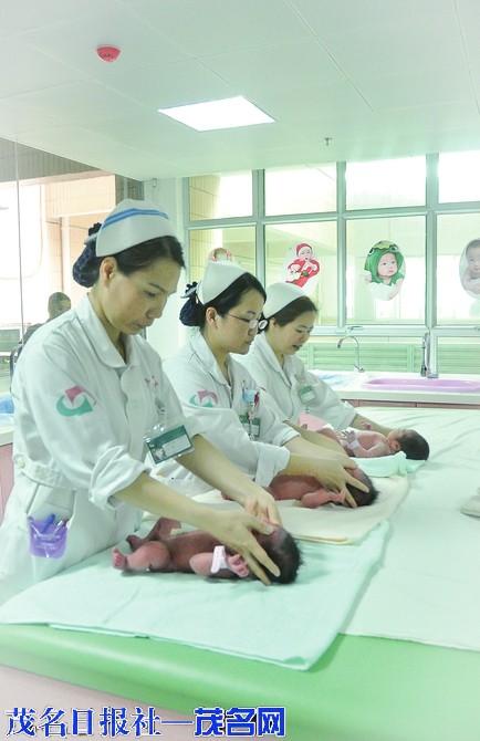 梁少梅(左一)给新生儿抚触。 通讯员李明圆 摄