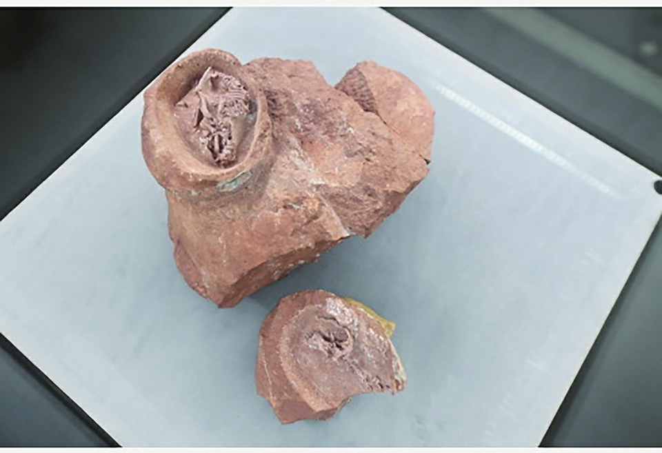 在福建省英良石材自然历史博物馆陈列的一组鸭嘴龙胚胎化石(5月11日摄)。新华社记者林善传摄