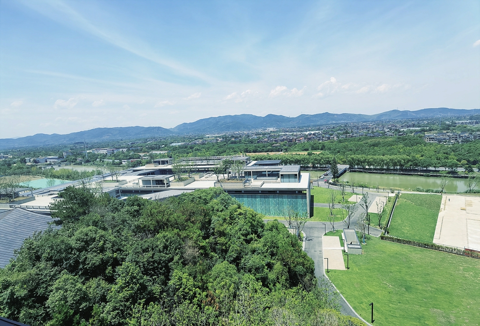 杭州国家版本馆和它北侧(有桥)的良渚港。新华社记者 冯源 摄