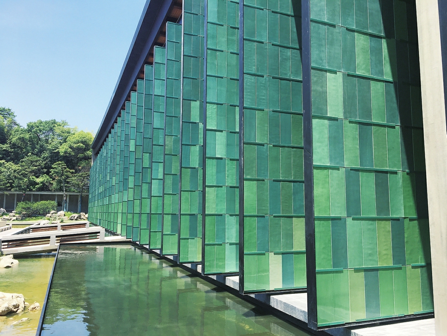 龙泉青瓷在宋代进入鼎盛时期,杭州国家版本馆多处都使用了龙泉青瓷屏扇。王澍说,屏扇的灵感来自于南宋画家马远《华灯侍宴图》中的小方格屏扇,青瓷的材质则是因为“文润阁”中的“润”令他想到了“君子温润如玉”,而青瓷正因色泽如玉而受人喜爱。