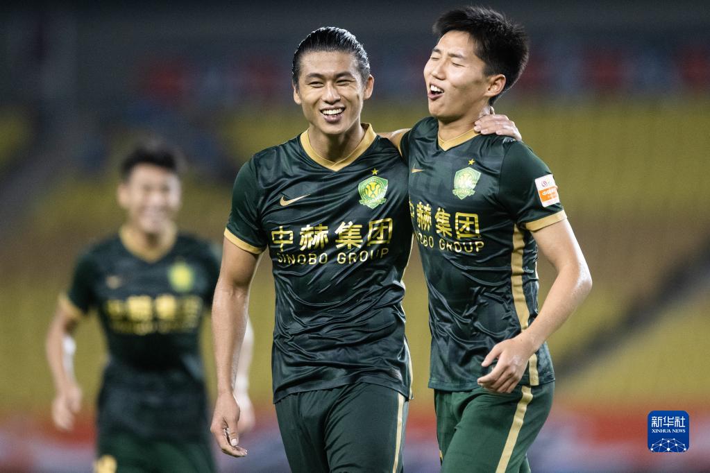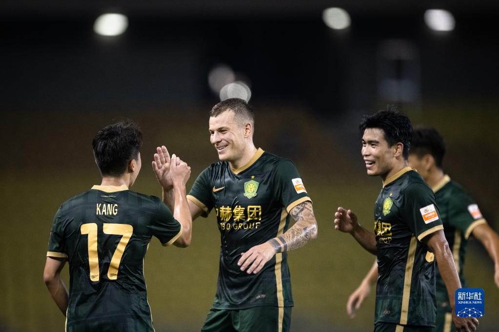 8月17日,北京国安队球员姜祥佑(左)在进球后与队友庆祝。新华社记者 肖艺九 摄