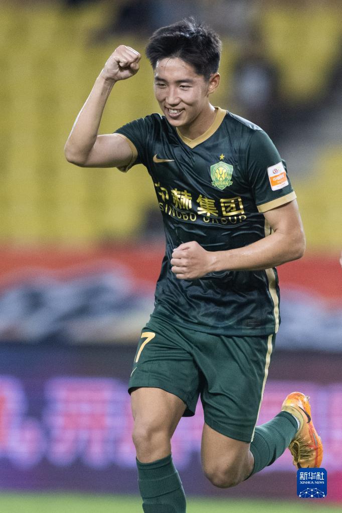 8月17日,北京国安队球员曹永竞在进球后庆祝。新华社记者 肖艺九 摄