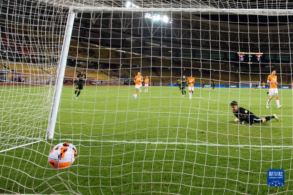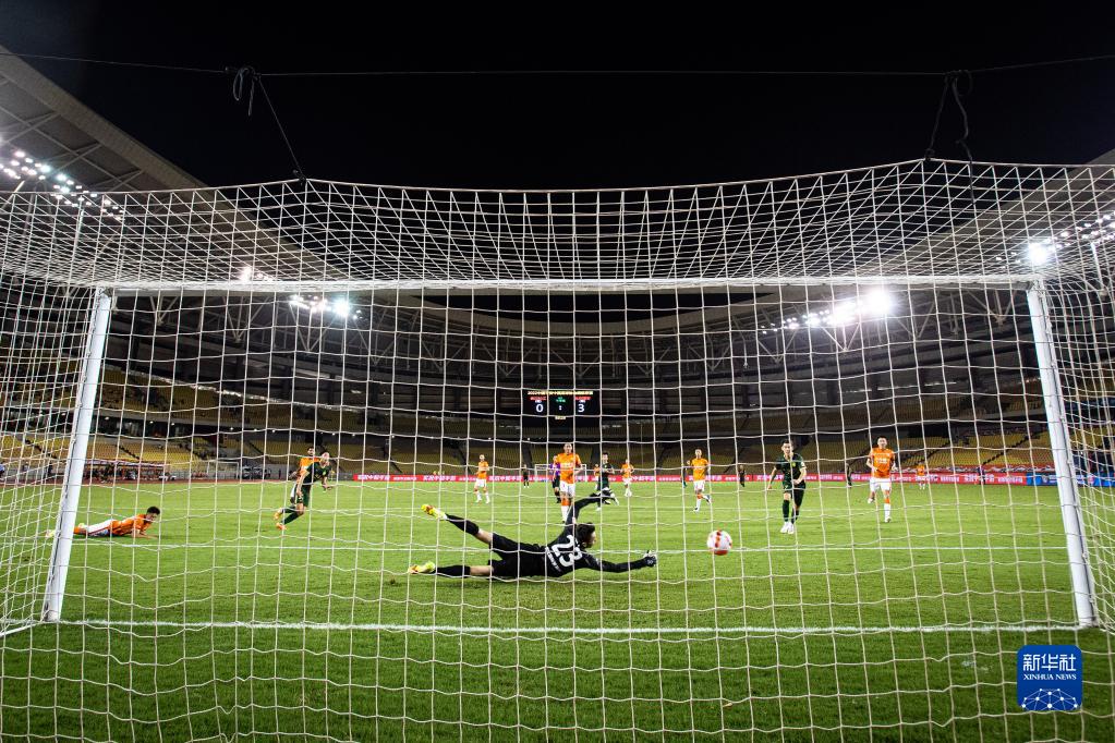 8月17日,武汉长江队守门员高翔(中)在比赛中扑救失利。新华社记者 肖艺九 摄