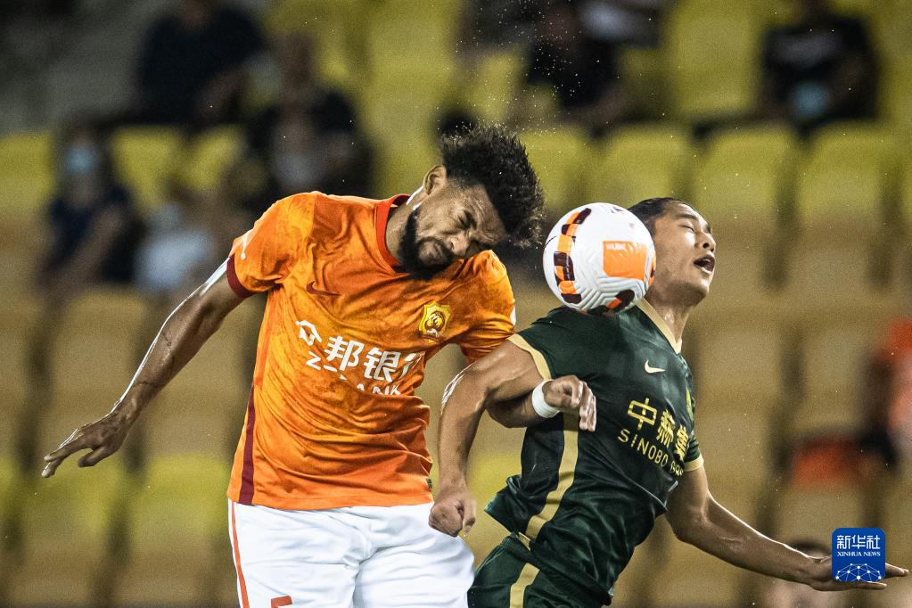 8月17日,武汉长江队球员布鲁诺(左)在比赛中与北京国安队球员张玉宁争顶。新华社记者 肖艺九 摄