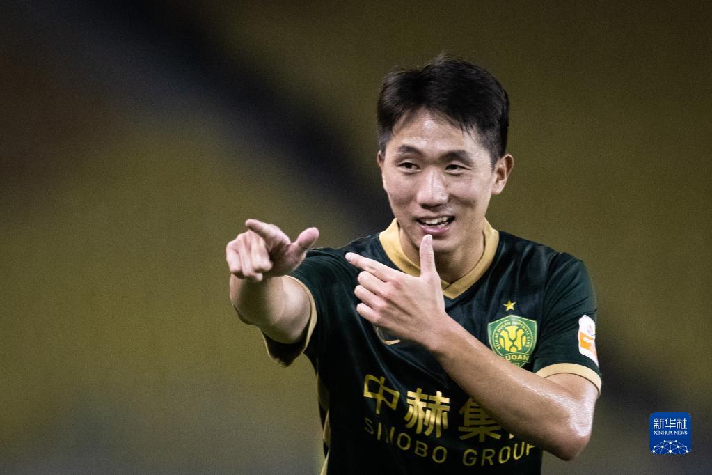 8月17日,北京国安队球员姜祥佑在进球后庆祝。新华社记者 肖艺九 摄
