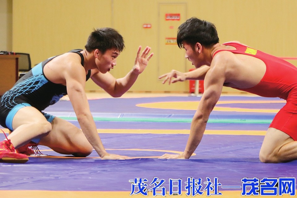 我市参加男子自由式摔跤项目70公斤级决赛选手田儒成(左)在比赛现场。茂名日报社全媒体记者吴云杰摄