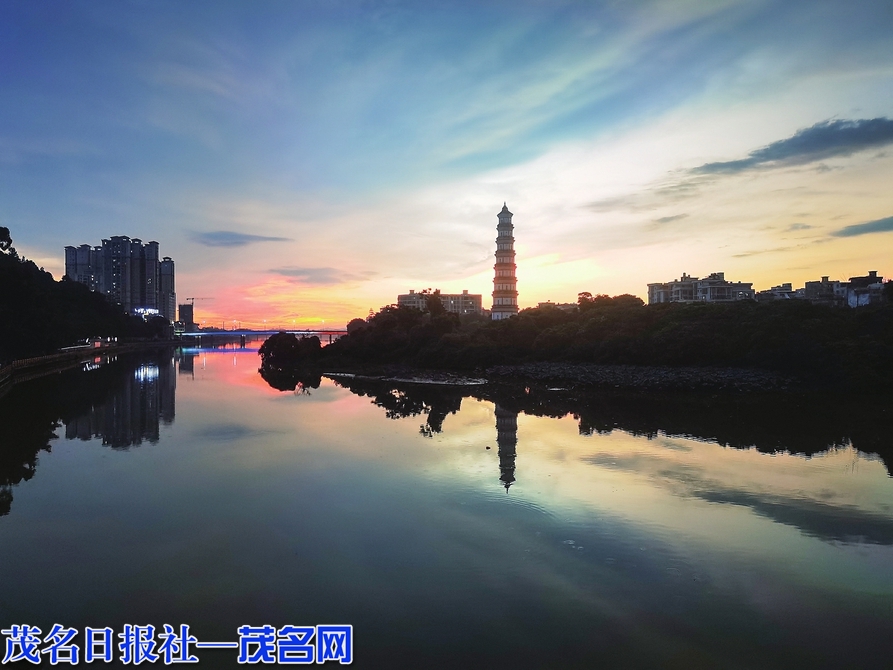 23日是处暑,傍晚六七点钟,随着太阳从西边的山头慢慢坠落,鉴江上空又是彩霞满天,红彤彤一大片,像一面巨大的红旗在迎风飘扬。宽阔的江面被染得通红,闪烁着耀眼的粼粼波光,犹如一匹长长的飘动的彩绸。雄伟的宝光塔巍然屹立,此刻,悠久的历史、深厚的文化底蕴与此时华丽的色彩交织在一起,如梦似幻。不久,这里又幻化出别样的色彩,蓝色的夜幕包围着鲜红的晚霞,远处的街灯如璀璨的明珠。
