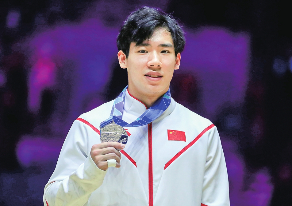 ▲11月4日,张博恒在颁奖仪式上展示银牌。 新华社记者李颖摄