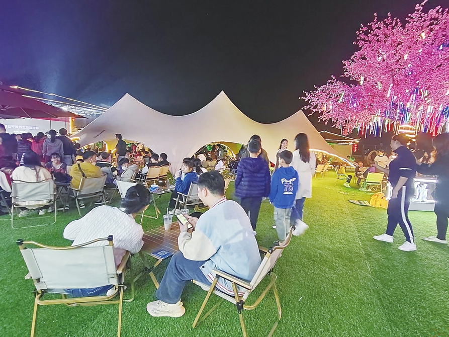 昨晚,记者前往位于该镇新圩村的会仁潮饮。尚未到夜市,远远即可看到夜市门口璀璨灯光。在夜市门口,有摆满气球、灯笼、小玩具等物品的小摊档,家长陪着孩子慢慢挑选,孩子脸上洋溢着开心的笑容。此时,正是饭后时间,周边不少群众纷纷走出家门,来到夜市休闲娱乐。置身夜市,仿佛进入了露营基地。放眼望去,夜市面积不算大,但错落有致,铺满草皮,搭着天幕和帐篷。小吃摊档并不多,但各种摊档一字排开,烧烤、饮品等美食应有尽有。顾客挑选着喜爱的食物,档主则忙着下单和制作。下完单后,顾客会选自己喜欢的座位入座,与亲朋好友围桌叹茶,聊天赏乐。昨日是年初二,夜市大舞台安排了精彩的表演节目。据了解,自开业到年初九,夜市大舞台都安排了表演,由14个村(居)委会轮流安排节目表演,丰富了当地群众的夜间生活,活跃夜经济。附近村民小曾告诉记者:“这次回来过年,有种耳目一新的感觉。尤其是这个夜市,真不错,可以和家人朋友过来坐坐,放松一下心情。”