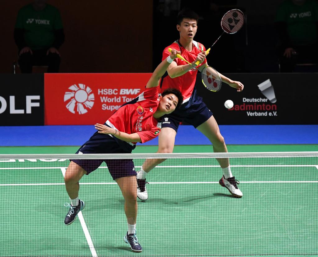 3月12日,冯彦哲(右上)/黄东萍在比赛中。