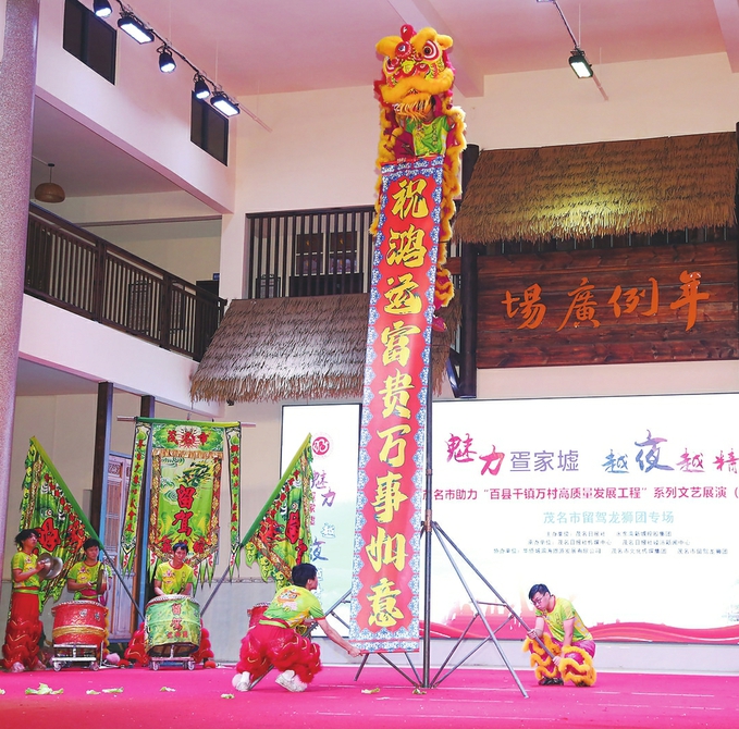 “咚咚锵……”聚光灯随着鼓锣声射向疍家墟·年例广场的舞台上,锣鼓喧天,龙狮齐舞,广场上一片欢乐的氛围。3月31日晚,以“魅力疍家墟越夜越精彩”为主题的茂名市助力“百县千镇万村高质量发展工程”系列文艺展演(第十二场)留驾龙狮团专场在此上演。一只只造型威猛、颜色各异的舞狮在疍家墟·年例广场的舞台上给广大群众带来了一场视觉盛宴。