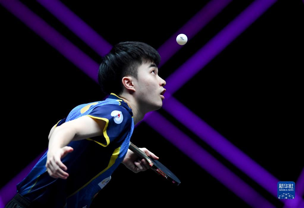 4月11日,林昀儒在比赛中发球。新华社记者 郝源 摄