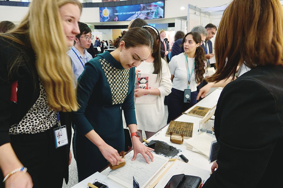 5月2日,在奥地利维也纳联合国城举行的2023年维也纳联合国中文日系列活动上,参访者体验中国传统拓印。 新华社发(王宙摄)