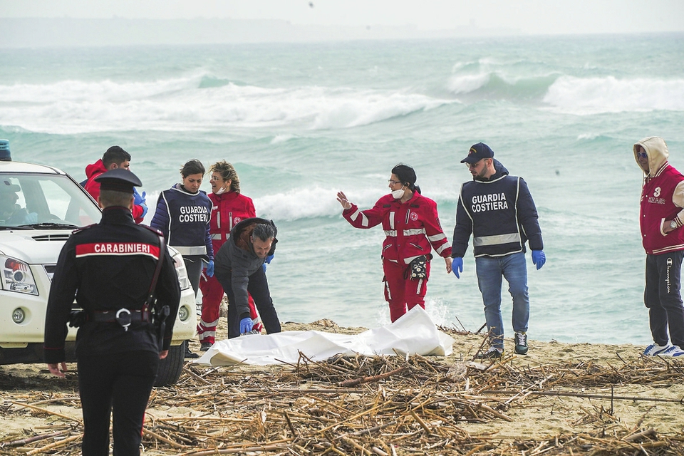 2月26日,在意大利南部卡拉布里亚大区库特罗附近,红十字会志愿者和海岸警察发现一具移民船沉船事故遇难者遗体。新华社/美联