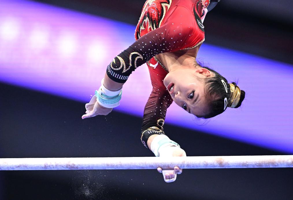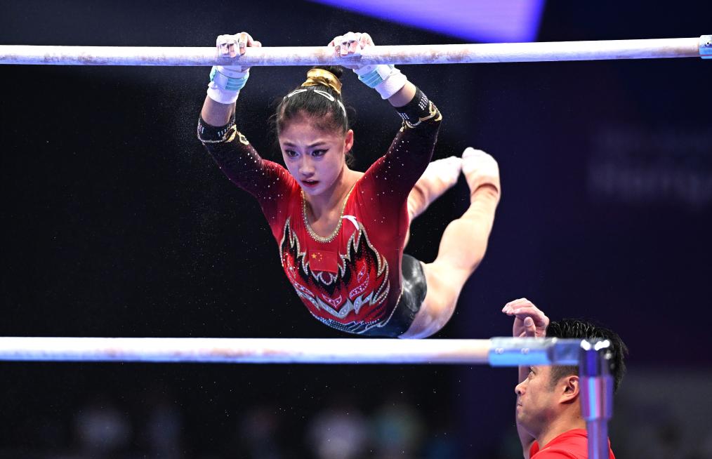 9月25日,中国队选手左彤在高低杠项目中。新华社记者 程敏 摄