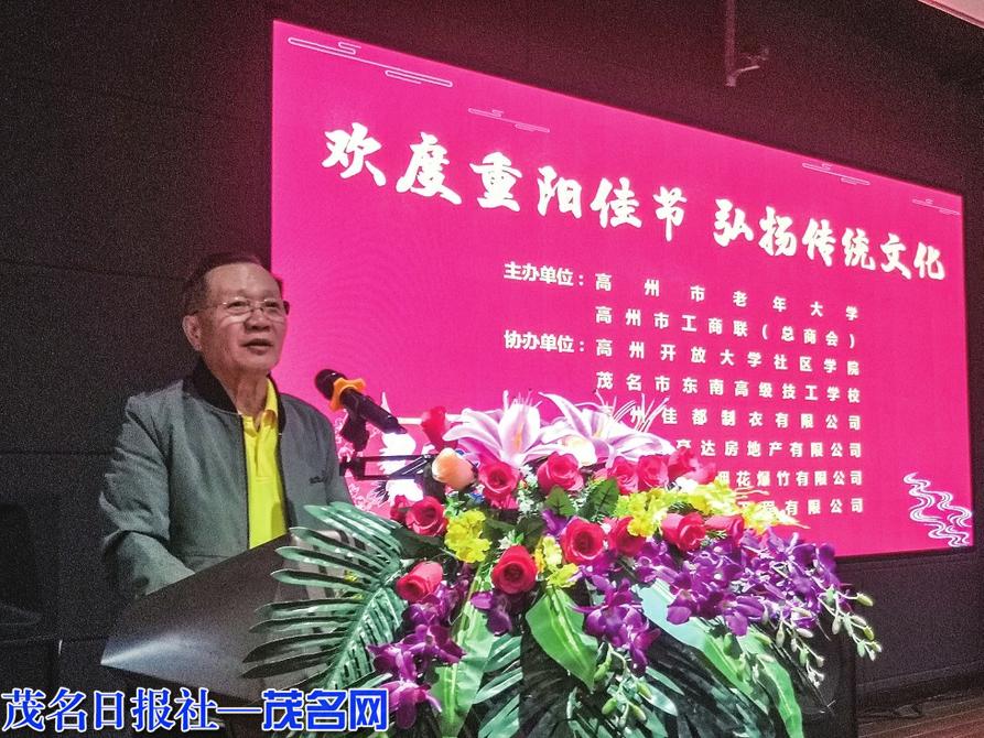 “重阳节是群众性的节日,也是老年人的节日。”高州市政协原副主席、高州市老年大学校长刘福文致辞中表示,“我们学校在市委市政府的正确领导下,在社会各界的关怀下,不断进步,不断发展。学员们在党的阳光雨露滋润下,老年生活幸福指数不断提高。本次重阳活动是高州市老年大学晚年生活的一件大事,是践行社会主义核心价值观的一次活动,意义重要。”