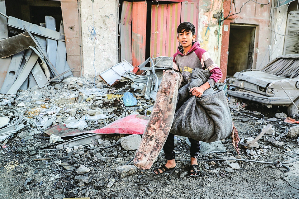 11月17日,在加沙地带南部城市汗尤尼斯,一名男孩走过遭以色列袭击后的建筑废墟。新华社发(里泽克·阿卜杜勒贾瓦德摄)