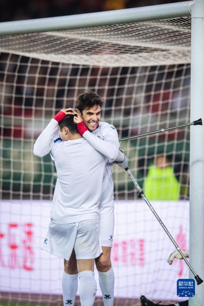 11月26日,美洲球星队球员何忆义(前)进球后与队友卡卡拥抱庆祝。新华社记者 伍志尊 摄