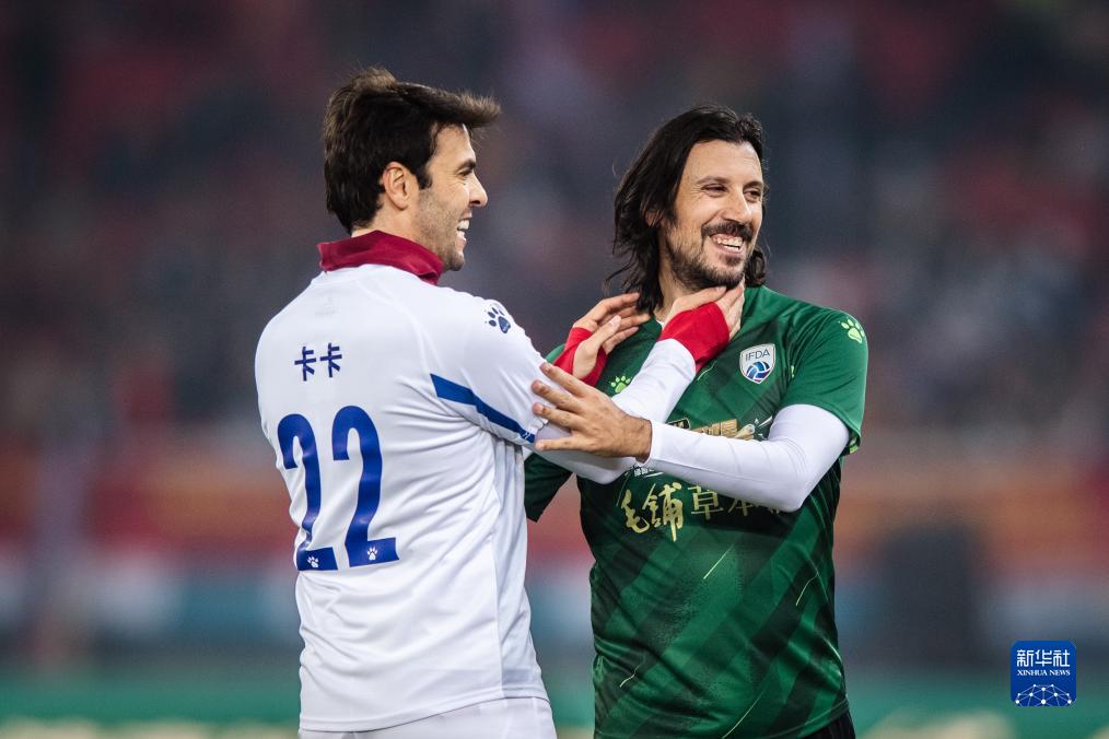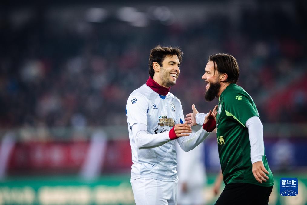 11月26日,美洲球星队球员卡卡(左)在比赛中和欧洲球星队球员扎卡尔多交流。新华社记者 伍志尊 摄