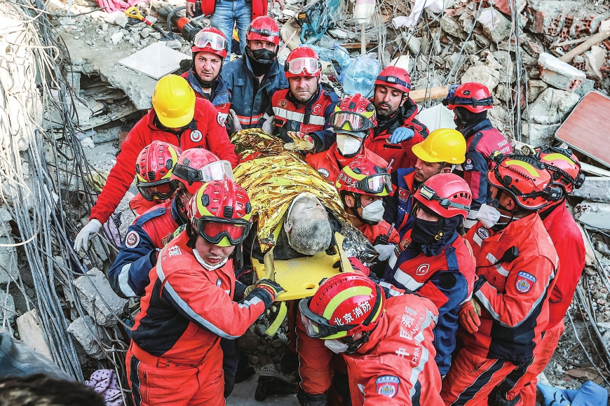 2023年2月12日,在土耳其哈塔伊省安塔基亚市,中国救援队与土耳其救援队转移一名救出的幸存者。新华社发(穆斯塔法·卡亚摄)