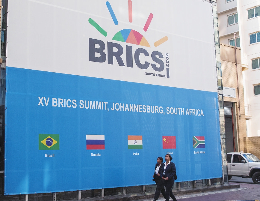 2023年8月21日,在南非约翰内斯堡,行人走过金砖国家领导人第十五次会晤举办场所桑顿会展中心。新华社记者张誉东摄