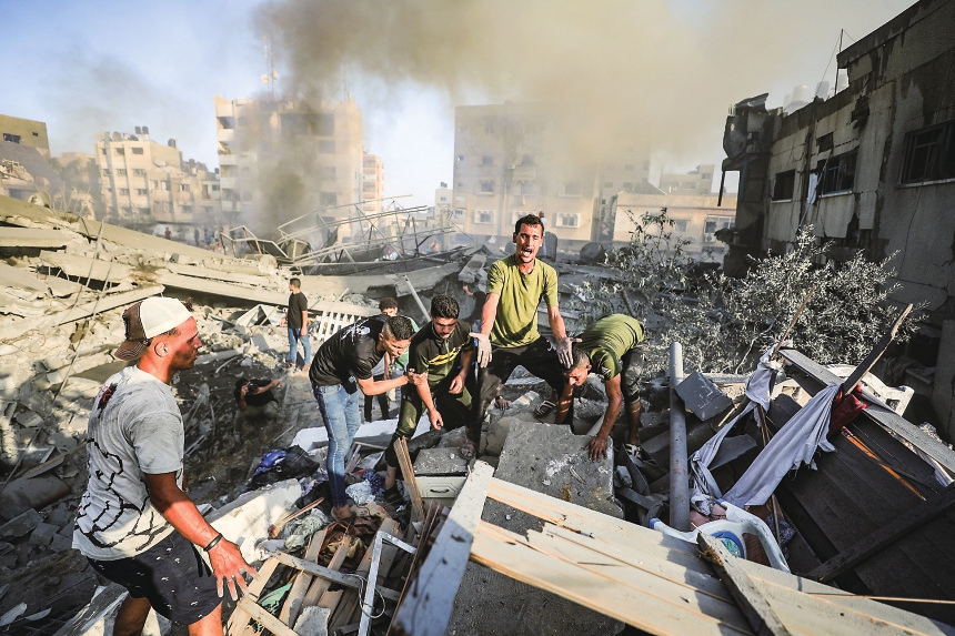 2023年10月25日,人们在加沙城遭袭后的建筑废墟中搜寻伤者。新华社发(亚西尔·库迪摄)