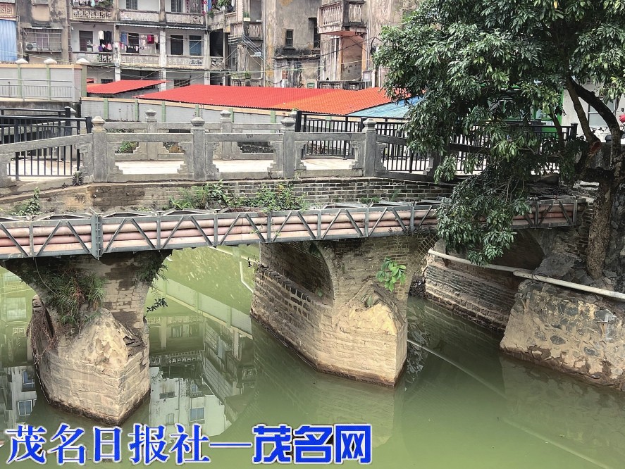 古桥横跨在狭窄的河道之上,依稀可以看见几处雕刻花纹,样貌虽已残旧,却可以看出古人造桥的精细。桥上行人与车辆来往不绝,不时有人驻足观景。极目远眺,远方的宝光塔雄伟壮观,古桥与南关街“南宫庵群”连成一体,亦作为广东古驿道遗址,成为历史文化名城——高州古城一道亮丽的风景线。