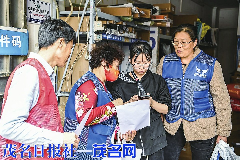 志愿者到临街商铺引导店主通过扫描二维码,填写创文调查问卷。茂名日报社全媒体记者甘杨松摄