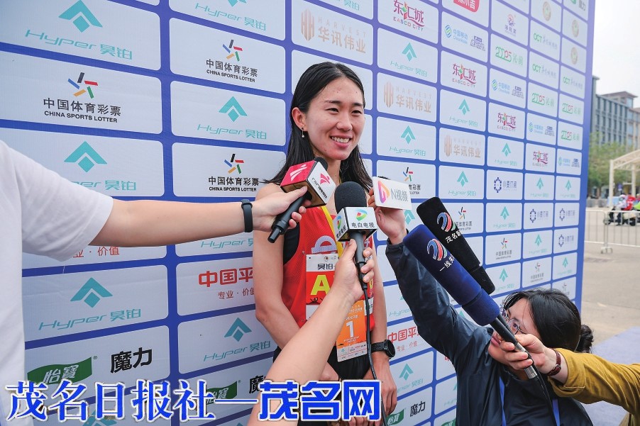 ▲马拉松女子组冠军杨俊婷接受记者采访。