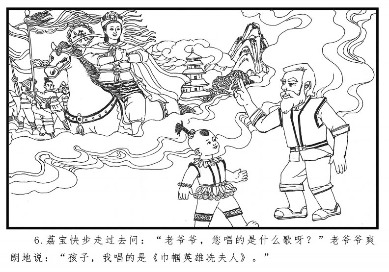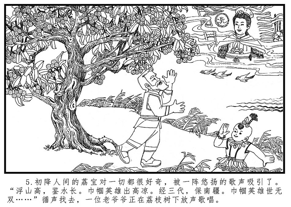 5.初降人间的荔宝对一切都很好奇,被一阵悠扬的歌声吸引了。“浮山高,鉴水长。巾帼英雄出高凉。经三代,保南疆。巾帼英雄世无双……”循声找去,一位老爷爷正在荔枝树下放声歌唱。