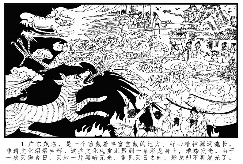 1.广东茂名,是一个蕴藏着丰富宝藏的地方。好心精神源远流长,非遗文化熠熠生辉。这些文化瑰宝汇聚到一条彩龙身上,璀璨发光。由于一次天狗食日,天地一片黑暗无光,重见天日之时,彩龙却不再发光了。