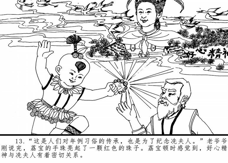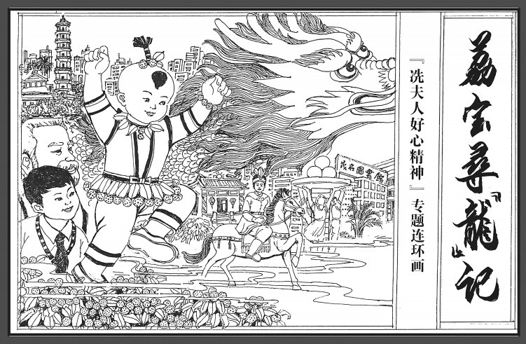 创作一部高质量、便于传播的专题连环画数字资源作品,是一个非常有创意的构想。连环画以冼夫人一生功绩所凝练出的“好心精神”为创作背景,选择崭新的角度、以带有童话色彩的荔宝寻“龙”作为主线,把一个个故事串连起来,把茂名非遗相关内容融入其中。这里有冼夫人信俗、茂名年例、木偶戏、沉香传说、冼太“回娘家”“探四邻”、电城炒米饼等,文字构思巧妙,画面贴近现实。在人物造型、服饰设计、场景表现及故事表达等,做到与“好心精神”相融合,体现岭南风格特点,充满茂名地方特色。将传统文化习俗与现代绘画语言相结合,在点、线、面、黑白灰、疏密节奏安排、场景气氛塑造等方面都有新的突破,以图文并茂视觉感强的连环画为载体,很好地表述冼夫人“好心精神”,讲好与之相关的传神故事。