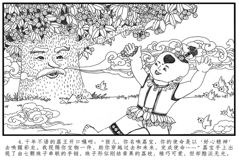 4.千年不语的荔王开口嘱咐:“孩儿,你名唤荔宝,你的使命是以‘好心精神’去唤醒彩龙。我现赐你宝物一件,助你穿越过去和未来,完成使命……”荔宝手上出现了由七颗珠子串联的手链,珠子形似刚结青果的荔枝,精巧可爱,但却黯淡无光。