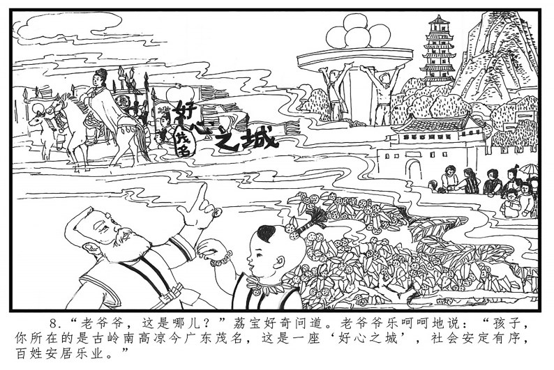8.“老爷爷,这是哪儿?”荔宝好奇问道。老爷爷乐呵呵地说:“孩子,你所在的是古岭南高凉今广东茂名,这是一座‘好心之城’,社会安定有序,百姓安居乐业。”
