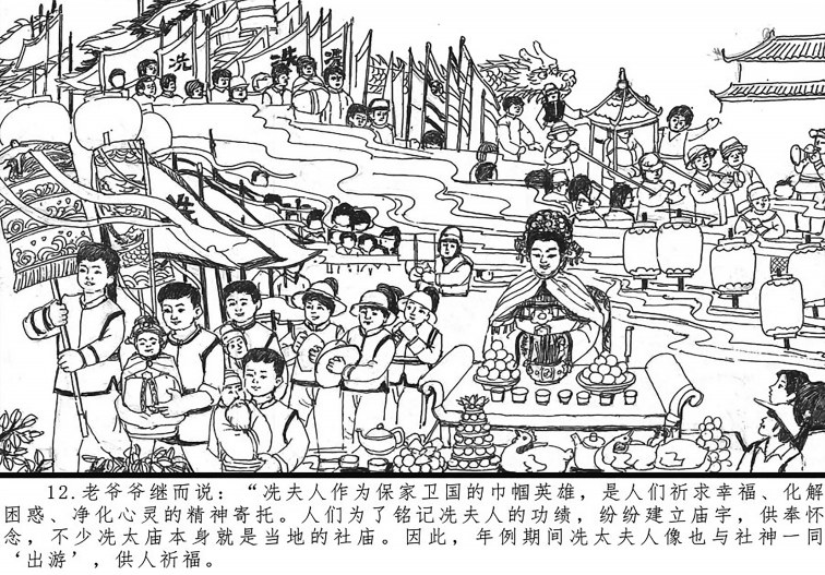 12.老爷爷继而说:“冼夫人作为保家卫国的巾帼英雄,是人们祈求幸福、化解困惑、净化心灵的精神寄托。人们为了铭记冼夫人的功绩,纷纷建立庙宇,供奉怀念,不少冼太庙本身就是当地的社庙。因此,年例期间冼太夫人像也与社神一同‘出游’,供人祈福。”
