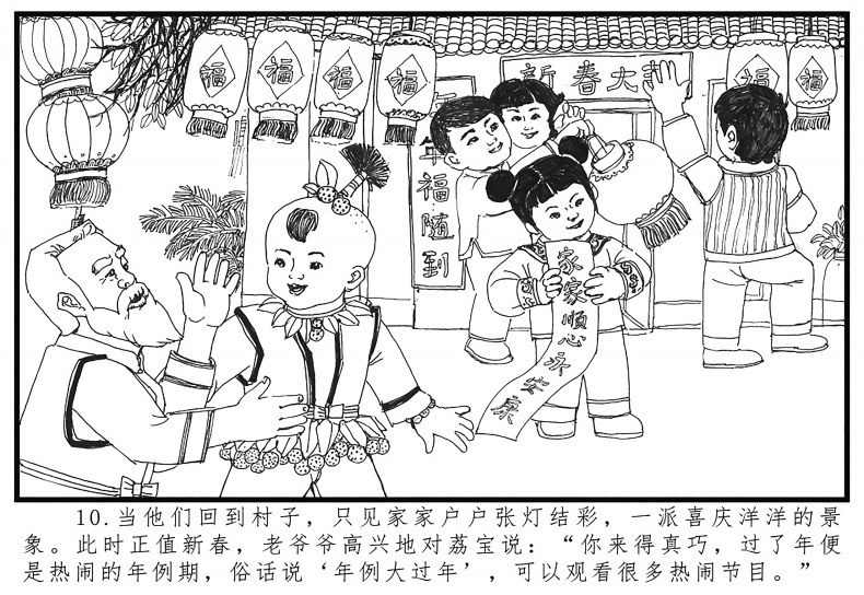 10.当他们回到村子,只见家家户户张灯结彩,一派喜庆洋洋的景象。此时正值新春,老爷爷高兴地对荔宝说:“你来得真巧,过了年便是热闹的年例期,俗话说‘年例大过年’,可以观看很多热闹节目。”