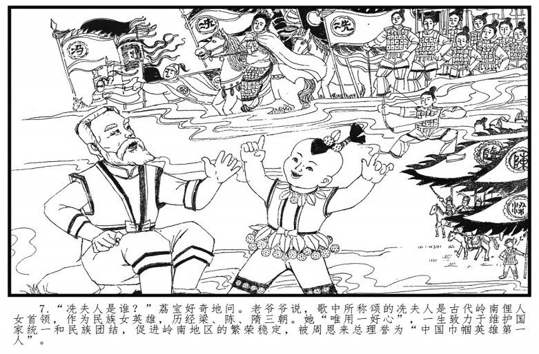 7.“冼夫人是谁?”荔宝好奇地问。老爷爷说,歌中所称颂的冼夫人是古代岭南俚人女首领,作为民族女英雄,历经梁、陈、隋三朝。她“唯用一好心”,一生致力于维护国家统一和民族团结,促进岭南地区的繁荣稳定,被周恩来总理誉为“中国巾帼英雄第一人”。