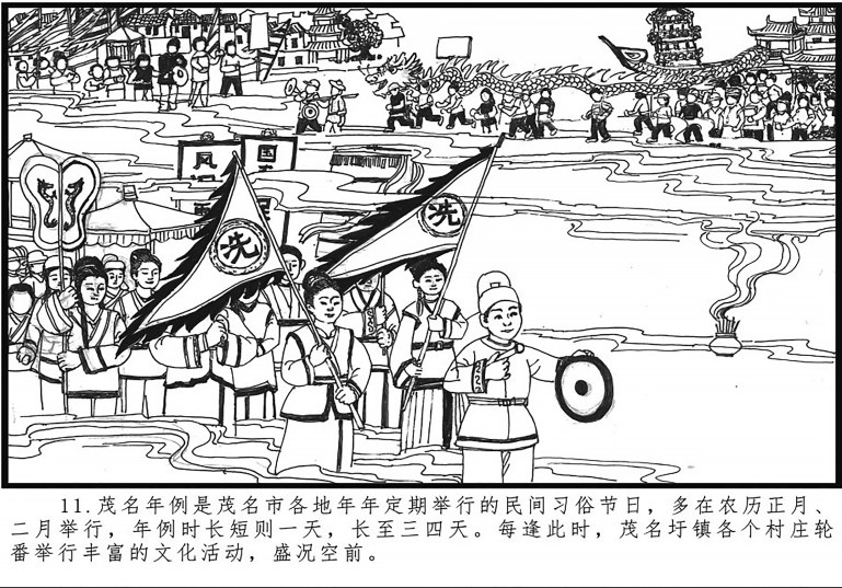 11.茂名年例是茂名市各地年年定期举行的民间习俗节日,多在农历正月、二月举行,年例时长短则一天,长至三四天。每逢此时,茂名圩镇各个村庄轮番举行丰富的文化活动,盛况空前。