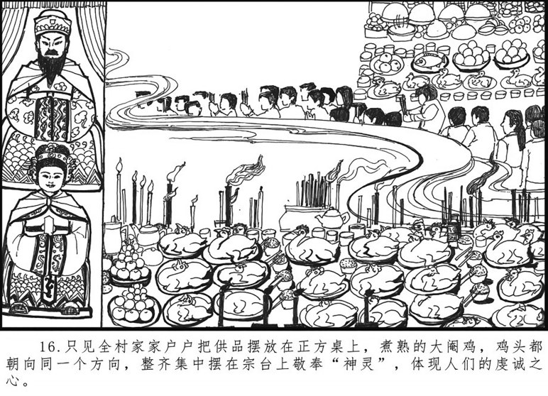 16.只见全村家家户户把供品摆放在正方桌上,煮熟的大阉鸡,鸡头都朝向同一个方向,整齐集中摆在宗台上敬奉“神灵”,体现人们的虔诚之心。