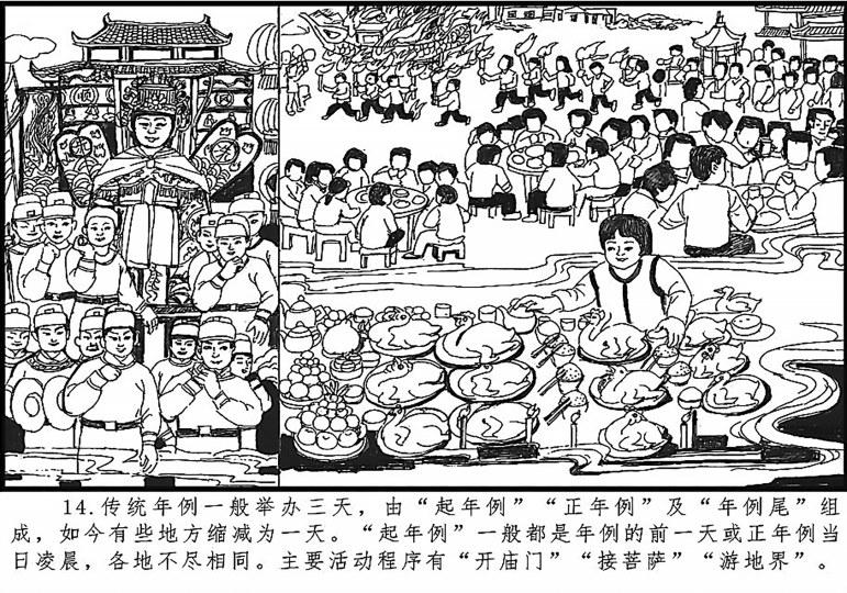 14.传统年例一般举办三天,由“起年例”“正年例”及“年例尾”组成,如今有些地方缩减为一天。“起年例”一般都是年例的前一天或正年例当日凌晨,各地不尽相同。主要活动程序有“开庙门”“接菩萨”“游地界”。
