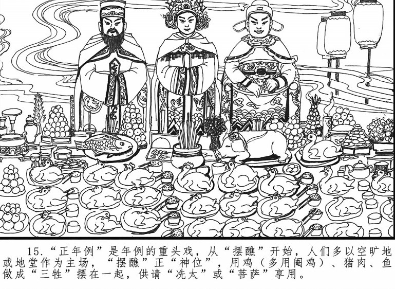 15.“正年例”是年例的重头戏,从“摆醮”开始,人们多以空旷地或地堂作为主场,“摆醮”正“神位”,用鸡(多用阉鸡)、猪肉、鱼做成“三牲”摆在一起,供请“冼太”或“菩萨”享用。
