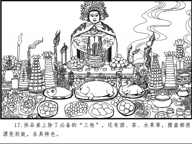 17.供品桌上除了必备的“三牲”,还有酒、茶、水果等,摆盘都很漂亮别致,各具特色。