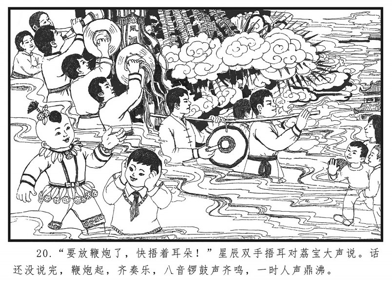 20.“要放鞭炮了,快捂着耳朵!”星辰双手捂耳对荔宝大声说。话还没说完,鞭炮起,齐奏乐,八音锣鼓声齐鸣,一时人声鼎沸。