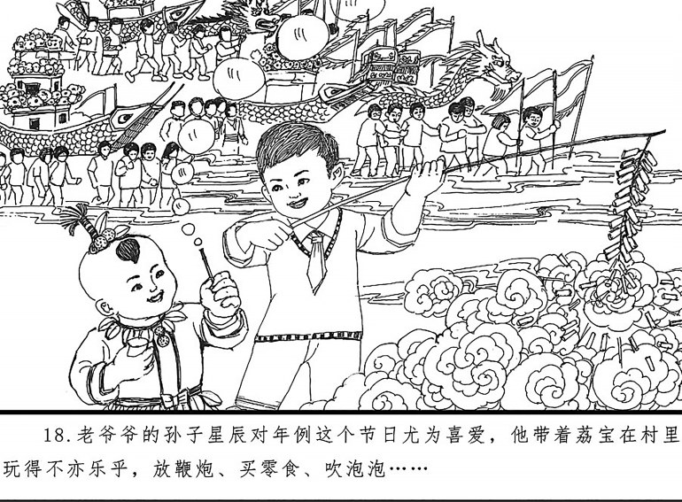 18.老爷爷的孙子星辰对年例这个节日尤为喜爱,他带着荔宝在村里玩得不亦乐乎,放鞭炮、买零食、吹泡泡……