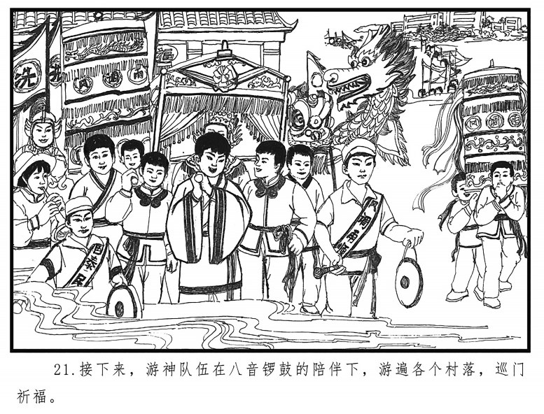 21.接下来,游神队伍在八音锣鼓的陪伴下,游遍各个村落,巡门祈福。