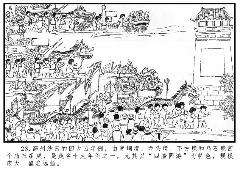 23.高州沙田的四大园年例,由冒垌境、龙头境、下方境和乌石境四个庙社组成,是茂名十大年例之一,尤其以“四船同游”为特色,规模庞大,盛名远扬。